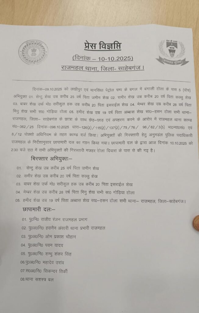 झारखंड राजमहल (साहिबगंज), 10 अक्टूबर 2025।अनुमंडल पुलिस पदाधिकारी नितिन खंडेलवाल ने प्रेस कॉन्फ्रेंस कर जानकारी दी कि दिनांक 9 अक्टूबर 2025 को लखीपुर एवं मानसिंधा पेट्रोल पंप के बगल स्थित बंगाली टोला के पास एक छात्रा के साथ छेड़छाड़ एवं अपहरण की घटना घटी थी। इस संबंध में राजमहल थाना कांड संख्या 362/2025, दिनांक 9.10.2025, धारा 126(2)/115(2)/137(2)/75/76/96/62/3(5) भा.दं.सं. एवं 8/12 पोक्सो अधिनियम के तहत मामला दर्ज किया गया था।इस मामले में पुलिस ने त्वरित कार्रवाई करते हुए पांच अभियुक्तों को गिरफ्तार किया है— सेंटु शेख, उम्र करीब 25 वर्ष, पिता जमीन शेख समीर शेख, उम्र करीब 20 वर्ष, पिता कल्लु शेख बाबर शेख उर्फ मोहम्मद सरीकुल हक, उम्र करीब 20 वर्ष, पिता इसराईल शेख मेंबर शेख, उम्र करीब 28 वर्ष, पिता मिनु शेख (सभी निवासी गोड़िया टोला, थाना राजमहल)
